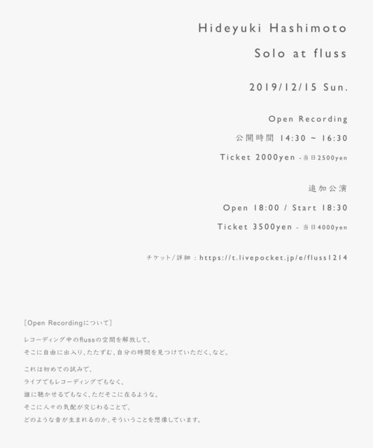 12/15の当日券は当日開場後に直接Flussまでお越しください。(チケットをお持ちの方から整理番号順での入場となります)